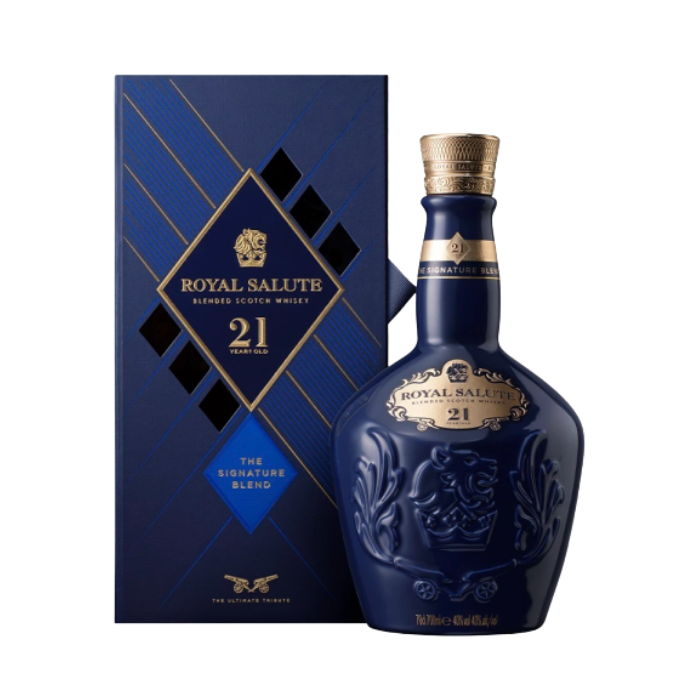 Uma cor profunda de âmbar dourado reflete a força e a intensidade do whisky Royal Salute 21 anos. Seu aroma revela suntuosos traços frutados de groselha doce e pera fresca, impregnados de um toque de avelãs e notas de alfazema. Ao paladar, o defumado de carvalho é intensificado por uma poderosa fragrância floral e uma aveludada cremosidade que envolve toda a boca. A apresentação do Royal Salute 21 anos é excepcionalmente refinada e de grande beleza. Cada garrafa desse whisky é feita de porcela inglesa, e é apresentada em três cores inspiradas nas cores das joias da Coroa Real: azul (safira), vermelha (rubi) e verde (esmeralda).O whisky Royal Salute 21 anos possui graduação alcóolica de 40%.